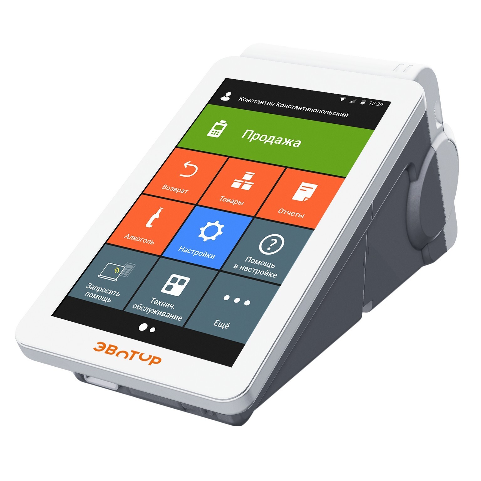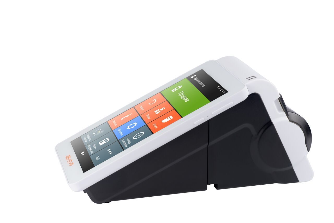 Конструкция терминала объединяет в себе блок печати чеков и сенсорный дисплей с предустановленным кассовым ПО на базе ОС Android. Программных возможностей Эвотор 7.2 достаточно, чтобы вести торговую деятельность: выполнять основные кассовые операции, вести товароучет и готовить отчетность.